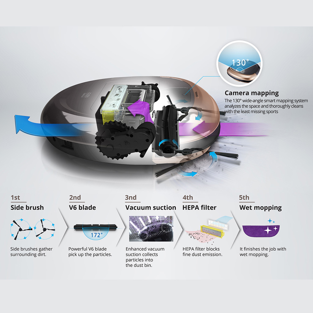 Vysoce účinný bezkartáčový BLDC motor s životností více než 10 let byl speciálně navržen tak, aby bylo dosaženo nejvyšší kvality čištění podlahy na jakémkoliv povrchu. Motor poskytuje vysoký sací výkon při nízké hlučnosti. Sací síla je až třikrát vyšší než u běžných konkurentů! Robot se vypořádá velmi dobře s nečistotami, jako jsou chlupy, prach, písek. Antibakteriální HEPA filtr zadrží drobný prach uvnitř nádobky. Prachovou nádobku lze velmi jednoduše vymýt vodou.