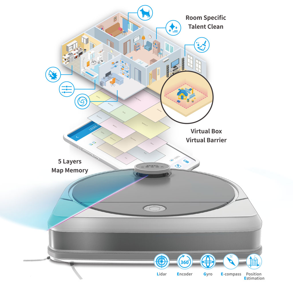 Důležitou vlastností robotických vysavačů je orientace a pohyb v prostoru. Přesnou lokalizaci a mapování pomocí laseru využívá robotický mop LEGEE 7. Pokročilá navigace LEGEE® SLAM měří, vyhodnocuje a optimalizuje cestu úklidu pomocí LDS LiDAR, Encoder, Gyro a E-kompas. Úklid probíhá systematicky a maximálně efektivně bez zbytečného zdržování.