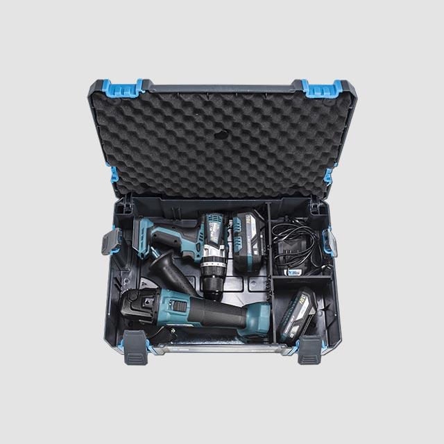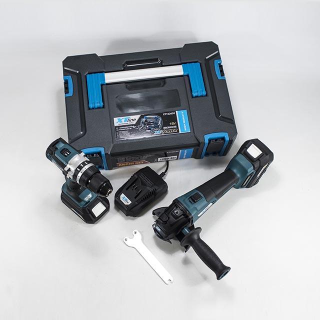 • Sada nářadí XTline obsahuje, aku úhlovou brusku, aku vrtačku (příklepová), nabíječka baterie, 1x aku baterie li-ion 18V, 4.0Ah, 1x aku baterie li- ion 18V, 2.0Ah a plastový box TOOLSTATION.