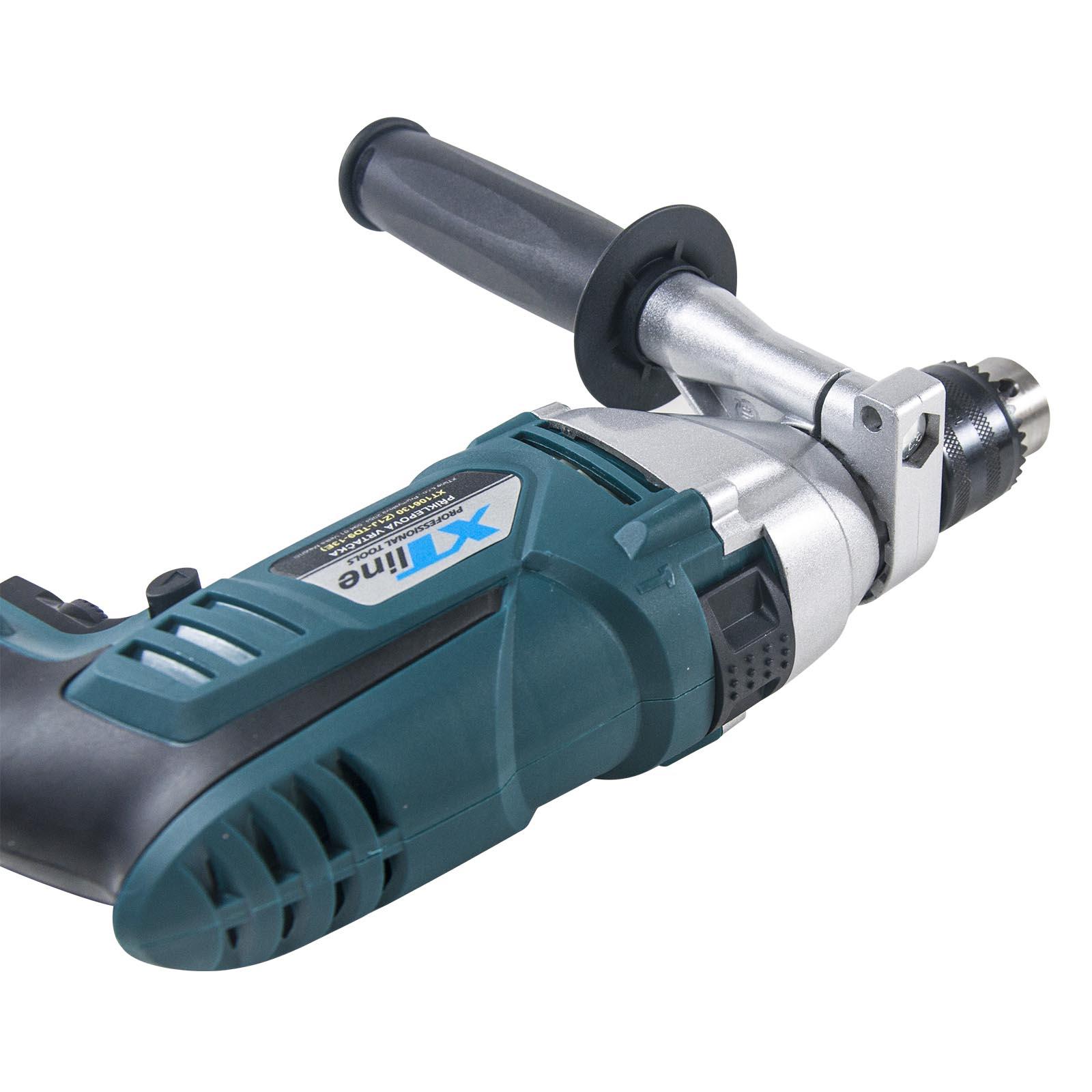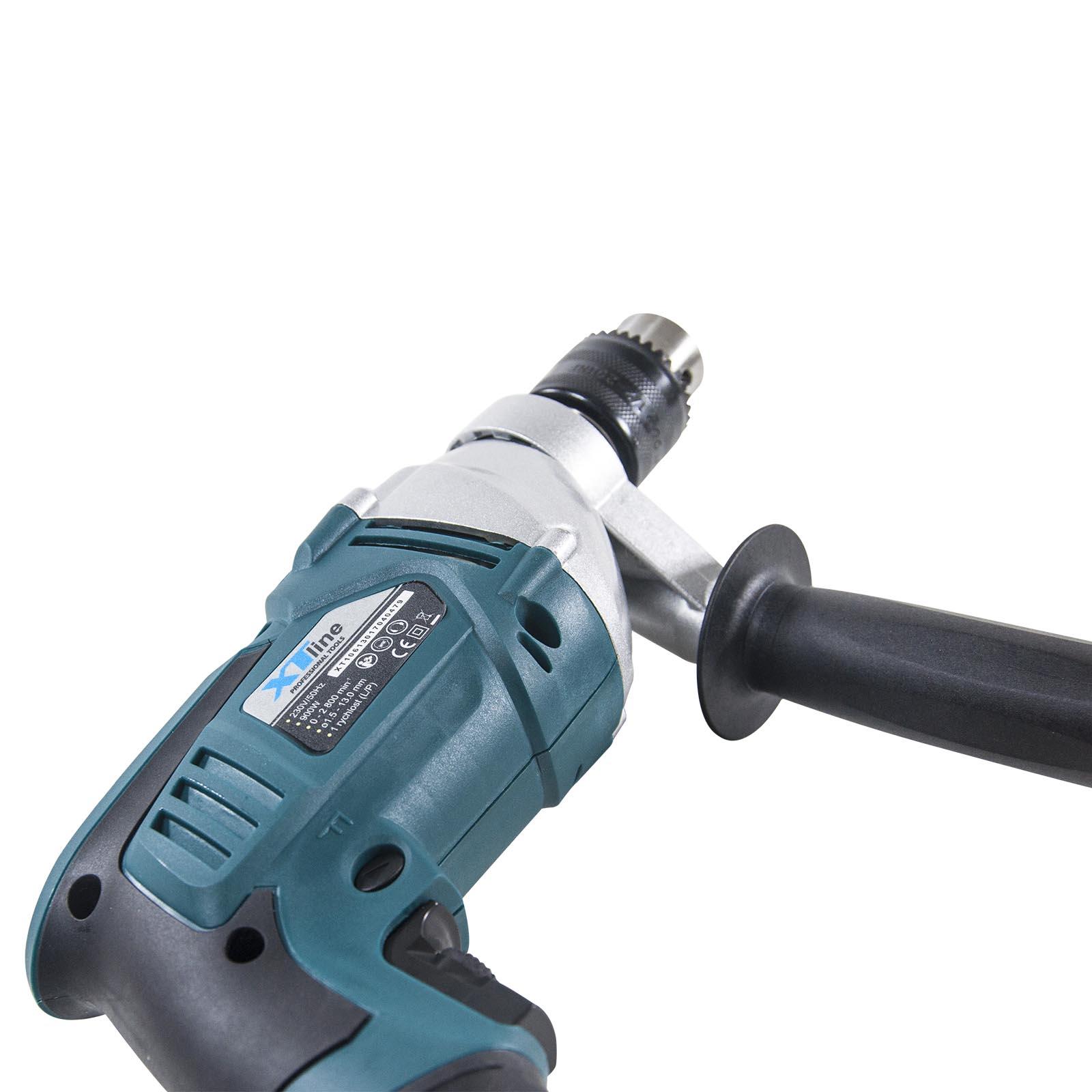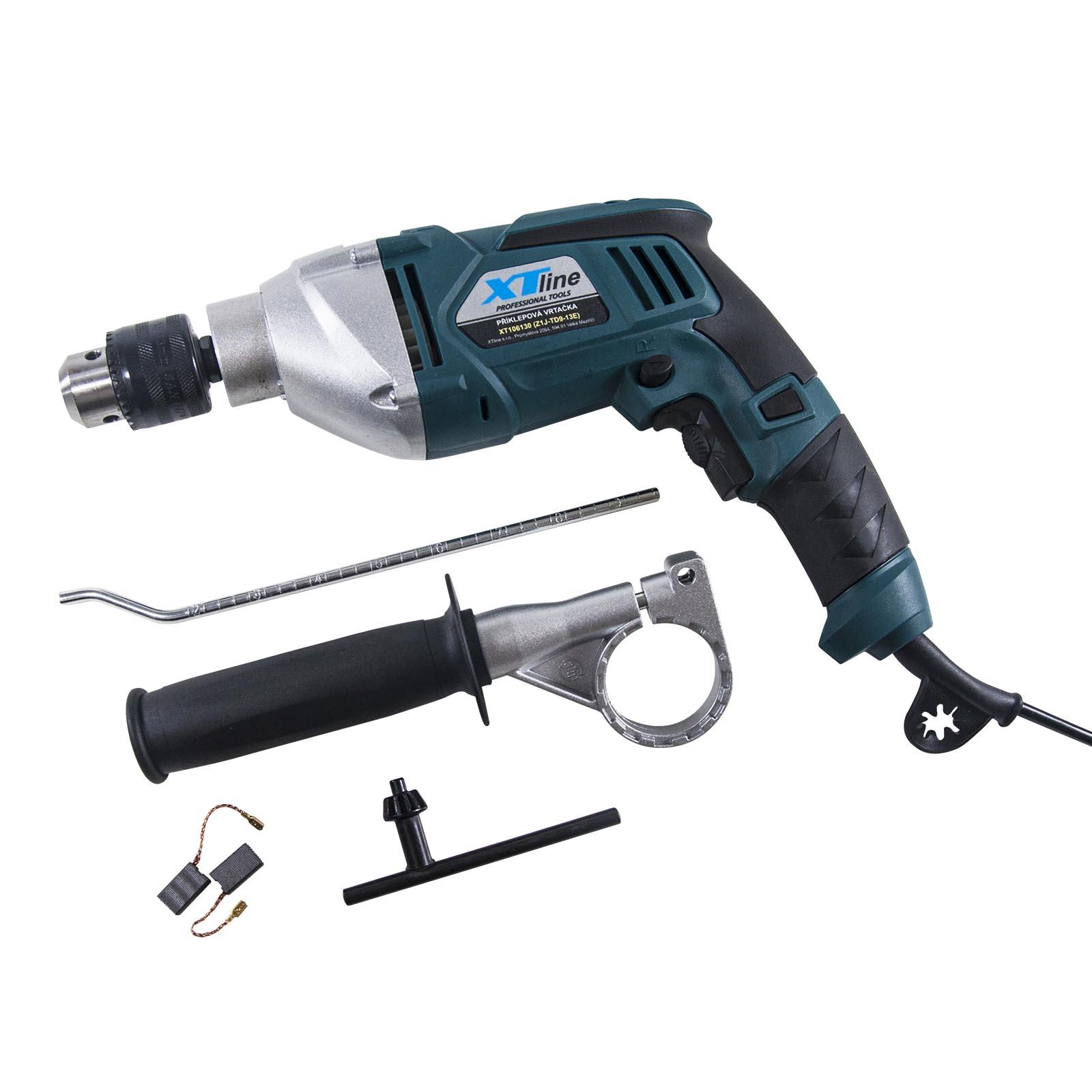 Příklepová vrtačka s kovovým sklíčidlem pro přesné vrtání, umožňuje snadné vrtání do všech materiálů, díky příklepu i do stavebních materiálů. Vrtačka je dobře ovladatelná díky velkému vypínači, přepínači směru chodu a plynulé regulaci otáček - vše na rukojeti. Předností pro vrtačku je výkonný motor pro vrtání/vrtání s příklepem, plynulá regulace otáček podle druhu materiálu, nízká hmotnost a kompaktní design a vysoký točivý moment Součást balení je pár uhlíků, hloubkový doraz, přídavná rukojeť, klička ke sklíčidlu.
